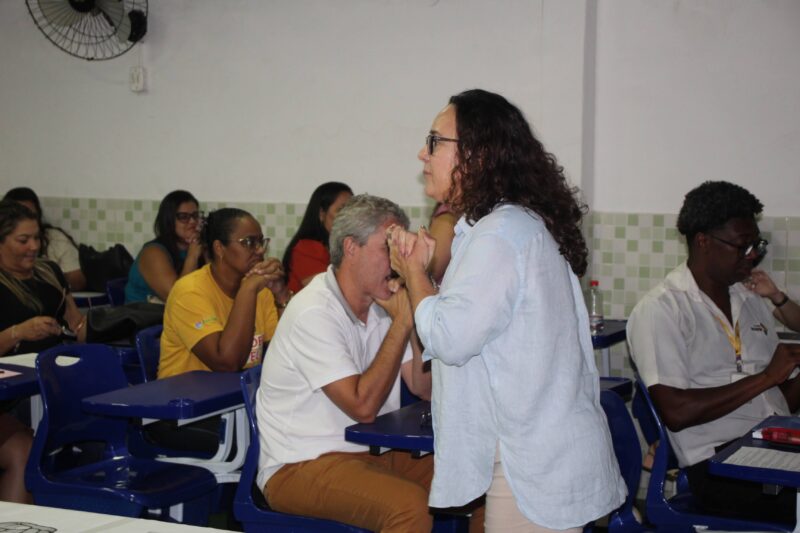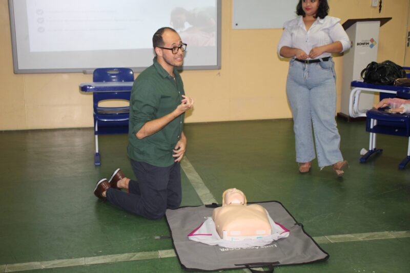 Para finalizar, os enfermeiros Efferson e Sara comandaram o treinamento de Primeiros Socorros – Lei Lucas para professores e funcionário.